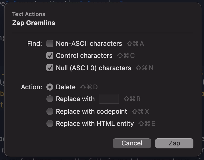 I just saw this in Nova, the code editor, which is very thoughtful; those shortcuts only exist within this dialog (and one wonders if they couldn’t just be letters without modifiers)?