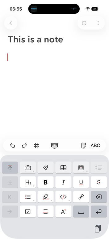 Bear (the note-taking app) does something interesting: after a button press, it replaces the onscreen QWERTY keyboard with a “funpad” or a “function keypad” (like StreamDeck or Figma Creator Micro). This achieves a similar result to a scrolling toolbar above the keyboard (see: Apple Notes), but in a different way. I haven’t seen anything like this before, and I think it’s really clever and it has worked well for me in practice.