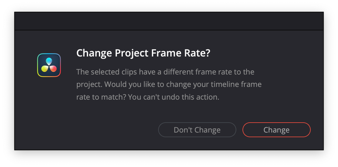 An extremely thoughtful moment in DaVinci Resolve. When you drop the first video clip into a new project, it suggests to update the settings of the entire project, on the correct assumption that the first media might set the tone of the whole thing.