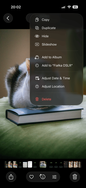 However, once you do that one time, a new menu option appears. It’s effectively “Add again quickly to the album you just chose” (Fiałka is the name of my cat):