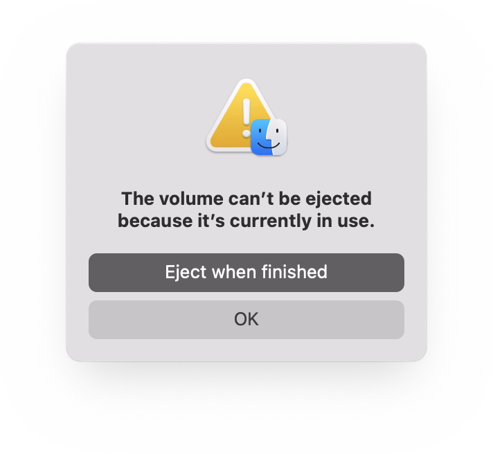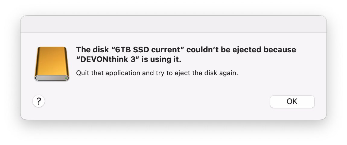 If you plug in a CD drive (he said with a straight face in the lord’s year 2026), and then eject too soon, the system offers this dialog, which allows you to say: Eject whenever you’re done with whatever you have to do.