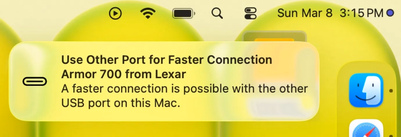 To Apple’s credit, macOS helps you understand the limitations – since the ports look the same and the USB-C cables are a hot mess, I think it is correct and welcome to try to remedy this in software. It looks like this, appearing in the upper right corner like all the other notifications: