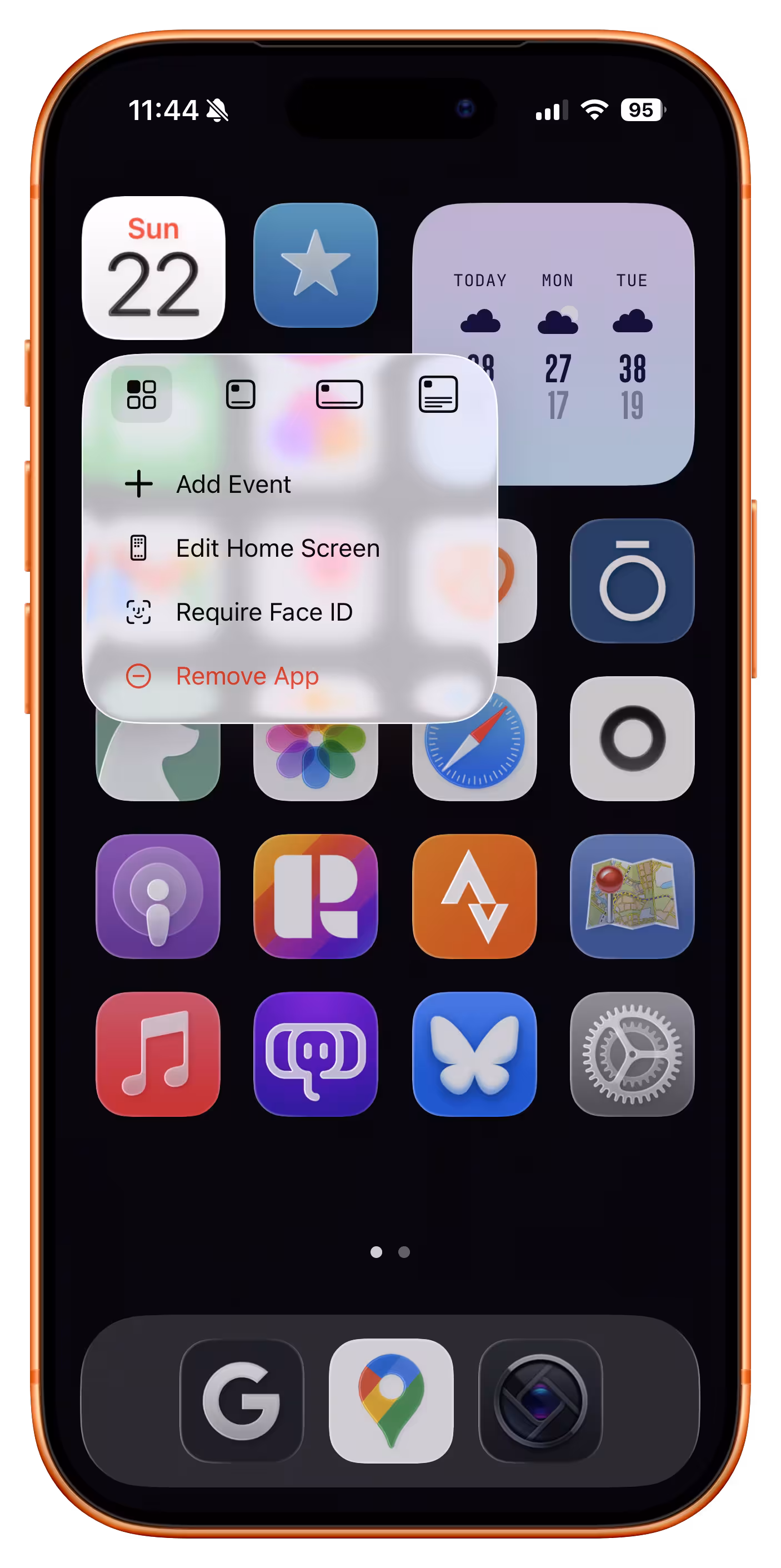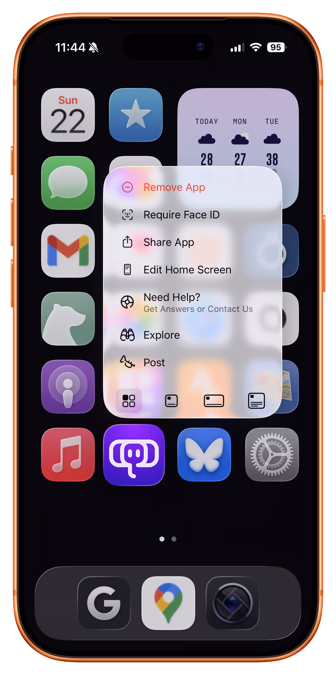 If you choose to remove the app names from the springboard, a small thing Apple could do would be to show the app name in the long-press menu here. Otherwise, I found it feels really easy to forget the name over time! (It would be a small riff on this disambiguation detail.)