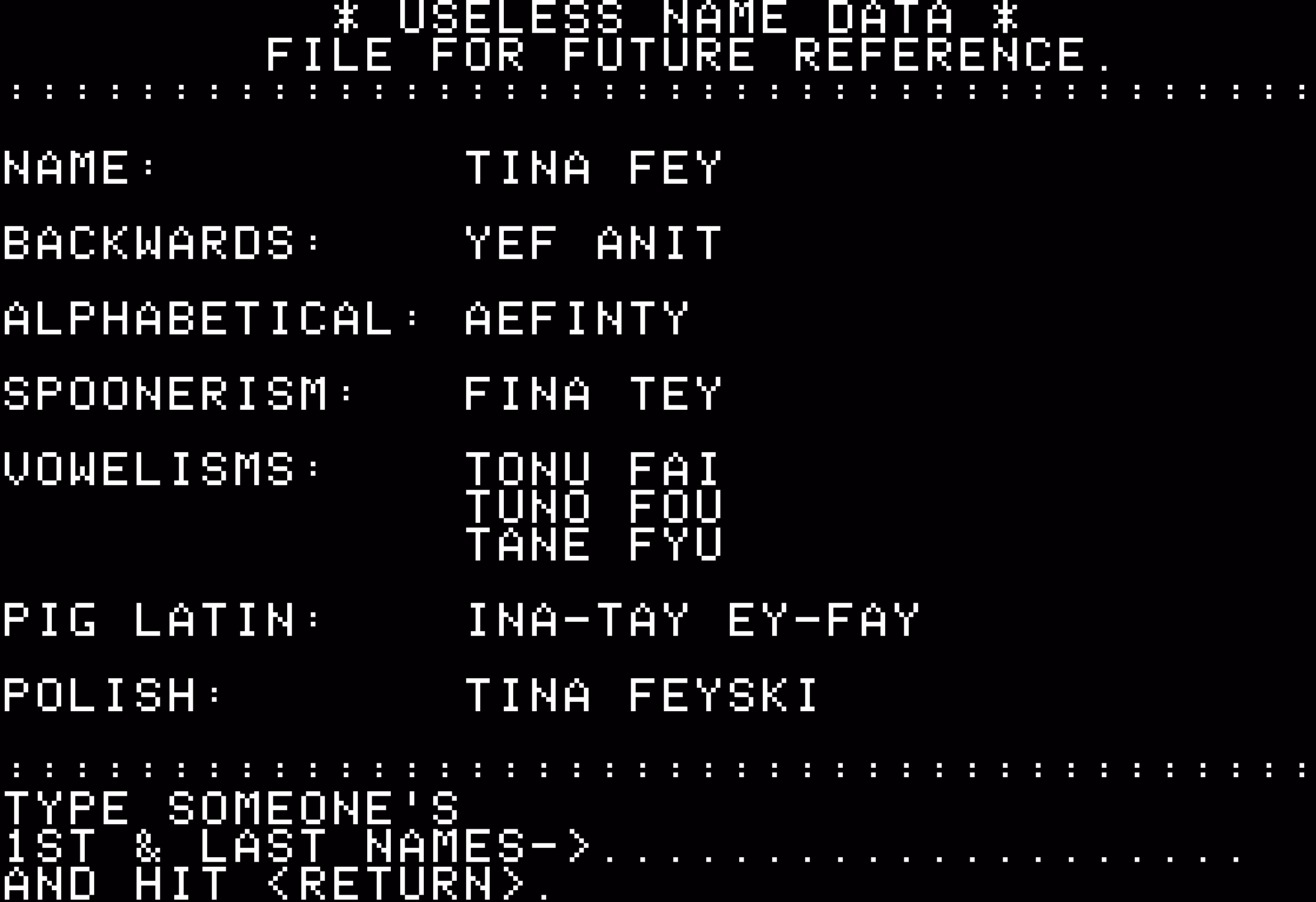 I hate these cute loading strings with passion. I think I’m in the minority. It’s a topic for a future time, but it was fun at least to trace some part of its history, sifting through hundreds of pages earnestly explaining the concept of “reticulating splines” to people. Whether they’re in on the joke, I am not sure.