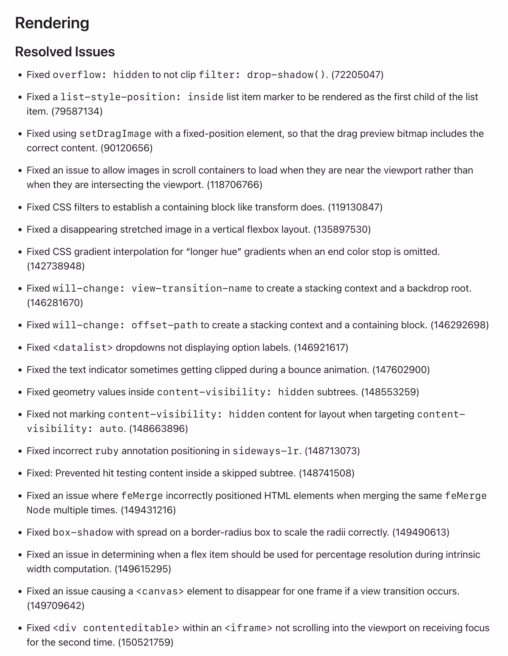 I wish either MDN or Can I use… integrated them in some way (and, of course Chrome’s and Firefox’s as well), so that looking up a certain feature or property – for example, will-change – would show you the recent changes in browsers in reverse chronological order, which could help you understand the details of the feature evolving, and help with debugging.