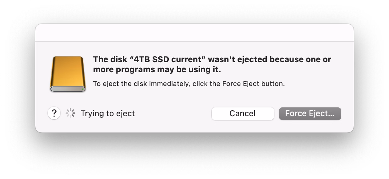 If you plug in a CD drive (he said with a straight face in the lord’s year 2026), and then eject too soon, the system offers this dialog, which allows you to say: Eject whenever you’re done with whatever you have to do.