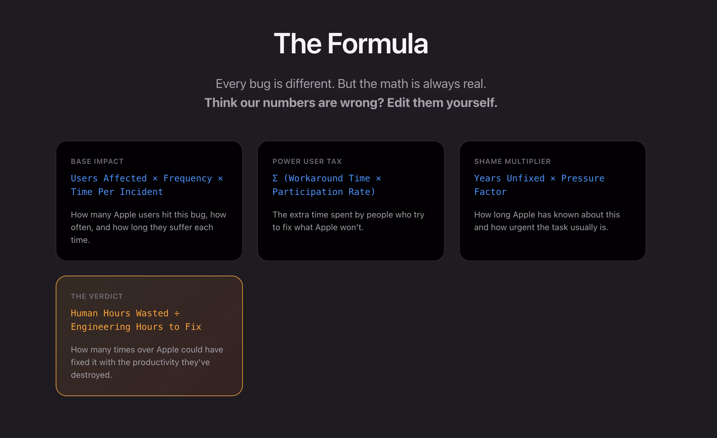 What I appreciate about this is that none of this is very “visible” stuff, but the insidious things that add up and bother on the daily basis, chipping away at your flow first and sanity second – which the site tries to quantify via a formula: