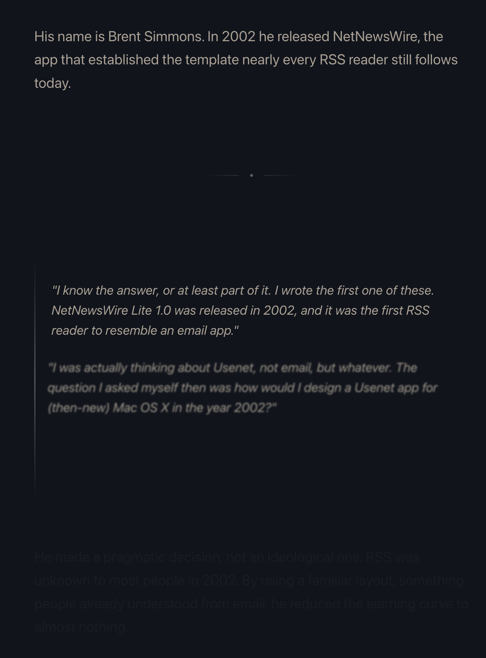 But here? Here letting contents shine and putting the UI atop feels like the absolutely right thing to do, since you are redesigning your reading experience.